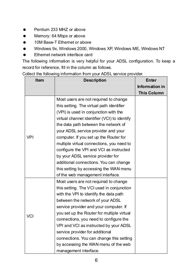 - 9. 6Pentium 233 MHZ or aboveMemory: 64 Mbps or above10M Base-T Ethernet or aboveWindows 9x, Windows 2000, Windows XP, Windows ME, Windows NTEthernet network interface cardThe following information is very helpful for your ADSL configuration. To keep arecord for reference, fill in the column as follows.Collect the following information from your ADSL service provider.Item Description EnterInformation inThis ColumnVPIMost users are not required to changethis setting. The virtual path identifier(VPI) is used in conjunction with thevirtual channel identifier (VCI) to identifythe data path between the network ofyour ADSL service provider and yourcomputer. If you set up the Router formultiple virtual connections, you need toconfigure the VPI and VCI as instructedby your ADSL service provider foradditional connections. You can changethis setting by accessing the WAN menuof the web management interface.VCIMost users are not required to changethis setting. The VCI used in conjunctionwith the VPI to identify the data pathbetween the network of your ADSLservice provider and your computer. Ifyou set up the Router for multiple virtualconnections, you need to configure theVPI and VCI as instructed by your ADSLservice provider for additionalconnections. You can change this settingby accessing the WAN menu of the webmanagement interface.