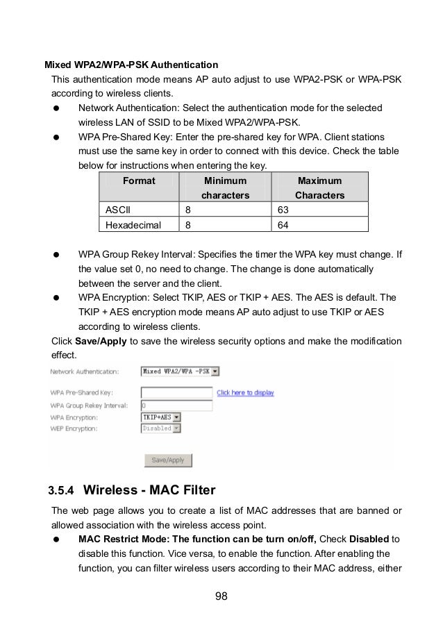 - 99. 98Mixed WPA2/WPA-PSK AuthenticationThis authentication mode means AP auto adjust to use WPA2-PSK or WPA-PSKaccording to wireless clients.Network Authentication: Select the authentication mode for the selectedwireless LAN of SSID to be Mixed WPA2/WPA-PSK.WPA Pre-Shared Key: Enter the pre-shared key for WPA. Client stationsmust use the same key in order to connect with this device. Check the tablebelow for instructions when entering the key.Format MinimumcharactersMaximumCharactersASCII 8 63Hexadecimal 8 64WPA Group Rekey Interval: Specifies the timer the WPA key must change. Ifthe value set 0, no need to change. The change is done automaticallybetween the server and the client.WPA Encryption: Select TKIP, AES or TKIP + AES. The AES is default. TheTKIP + AES encryption mode means AP auto adjust to use TKIP or AESaccording to wireless clients.Click Save/Apply to save the wireless security options and make the modificationeffect.3.5.4 Wireless - MAC FilterThe web page allows you to create a list of MAC addresses that are banned orallowed association with the wireless access point.MAC Restrict Mode: The function can be turn on/off, Check Disabled todisable this function. Vice versa, to enable the function. After enabling thefunction, you can filter wireless users according to their MAC address, either