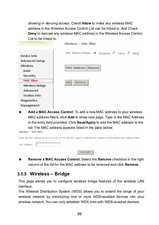 - 100. 99allowing or denying access. Check Allow to make any wireless MACaddress in the Wireless Access Control List can be linked to. And CheckDeny to banned any wireless MAC address in the Wireless Access ControlList to be linked to.Add a MAC Access Control: To add a new MAC address to your wirelessMAC address filters, click Add to show next page. Type in the MAC Addressin the entry field provided. Click Save/Apply to add the MAC address to thelist. The MAC address appears listed in the table below.Remove a MAC Access Control: Select the Remove checkbox in the rightcolumn of the list for the MAC address to be removed and click Remove.3.5.5 Wireless – BridgeThis page allows you to configure wireless bridge features of the wireless LANinterface.The Wireless Distribution System (WDS) allows you to extend the range of yourwireless network by introducing one or more WDS-enabled devices into yourwireless network. You can only establish WDS links with WDS-enabled devices.