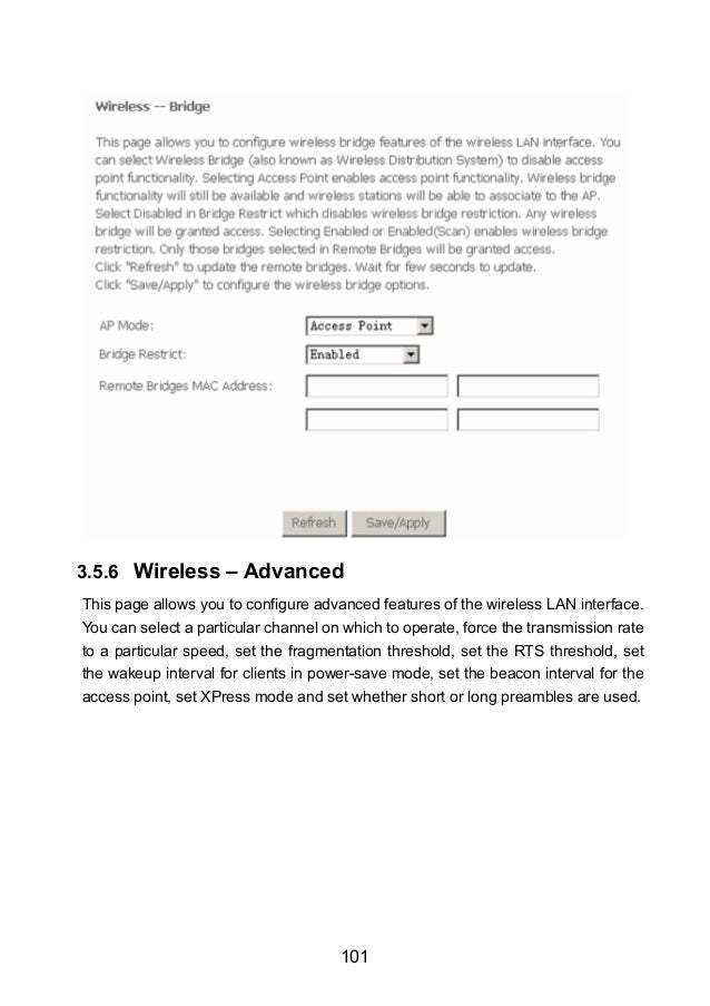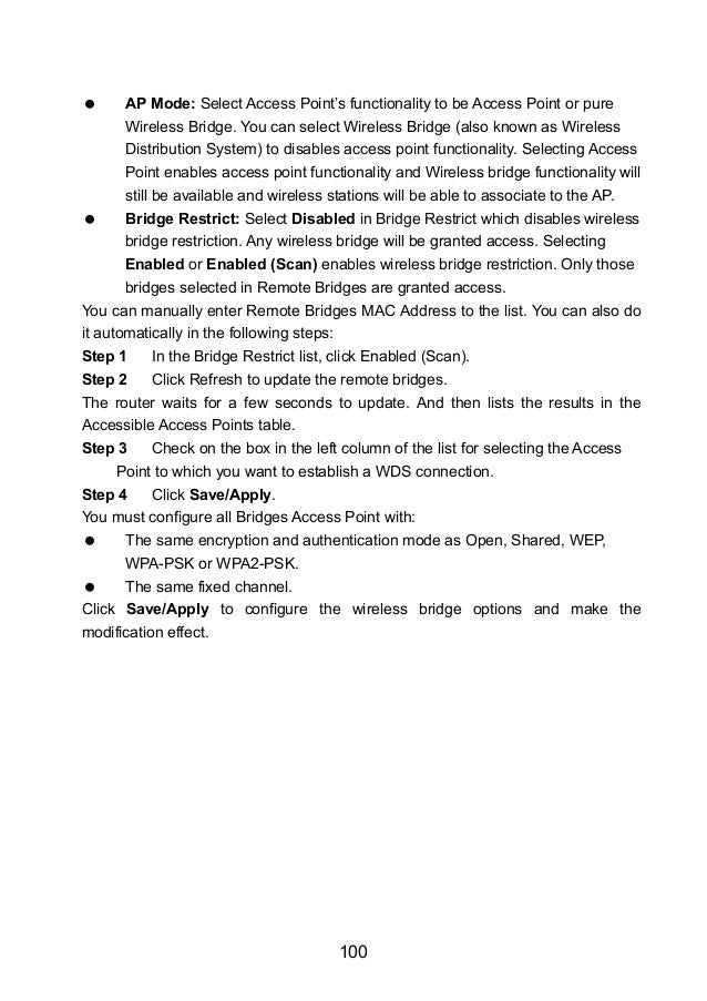 - 101. 100AP Mode: Select Access Point’s functionality to be Access Point or pureWireless Bridge. You can select Wireless Bridge (also known as WirelessDistribution System) to disables access point functionality. Selecting AccessPoint enables access point functionality and Wireless bridge functionality willstill be available and wireless stations will be able to associate to the AP.Bridge Restrict: Select Disabled in Bridge Restrict which disables wirelessbridge restriction. Any wireless bridge will be granted access. SelectingEnabled or Enabled (Scan) enables wireless bridge restriction. Only thosebridges selected in Remote Bridges are granted access.You can manually enter Remote Bridges MAC Address to the list. You can also doit automatically in the following steps:Step 1 In the Bridge Restrict list, click Enabled (Scan).Step 2 Click Refresh to update the remote bridges.The router waits for a few seconds to update. And then lists the results in theAccessible Access Points table.Step 3 Check on the box in the left column of the list for selecting the AccessPoint to which you want to establish a WDS connection.Step 4 Click Save/Apply.You must configure all Bridges Access Point with:The same encryption and authentication mode as Open, Shared, WEP,WPA-PSK or WPA2-PSK.The same fixed channel.Click Save/Apply to configure the wireless bridge options and make themodification effect.