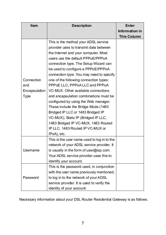- 10. 7Item Description EnterInformation inThis ColumnConnectionandEncapsulationTypeThis is the method your ADSL serviceprovider uses to transmit data betweenthe Internet and your computer. Mostusers use the default PPPoE/PPPoAconnection type. The Setup Wizard canbe used to configure a PPPoE/PPPoAconnection type. You may need to specifyone of the following connection types:PPPoE LLC, PPPoA LLC and PPPoAVC-MUX. Other available connectionsand encapsulation combinations must beconfigured by using the Web manager.These include the Bridge Mode (1483Bridged IP LLC or 1483 Bridged IPVC-MUX), Static IP (Bridged IP LLC,1483 Bridged IP VC-MUX, 1483 RoutedIP LLC, 1483 Routed IP VC-MUX orIPoA), etc.UsernameThis is the user name used to log in to thenetwork of your ADSL service provider. Itis usually in the form of user@isp.com.Your ADSL service provider uses this toidentify your account.PasswordThis is the password used, in conjunctionwith the user name previously mentioned,to log in to the network of your ADSLservice provider. It is used to verify theidentity of your account.Necessary information about your DSL Router Residential Gateway is as follows.