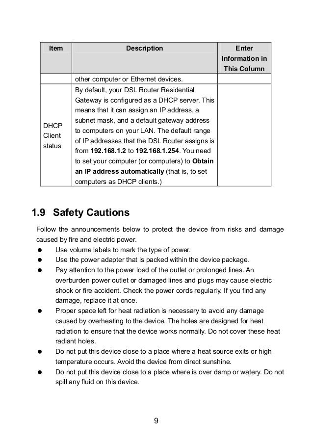 - 12. 9Item Description EnterInformation inThis Columnother computer or Ethernet devices.DHCPClientstatusBy default, your DSL Router ResidentialGateway is configured as a DHCP server. Thismeans that it can assign an IP address, asubnet mask, and a default gateway addressto computers on your LAN. The default rangeof IP addresses that the DSL Router assigns isfrom 192.168.1.2 to 192.168.1.254. You needto set your computer (or computers) to Obtainan IP address automatically (that is, to setcomputers as DHCP clients.)1.9 Safety CautionsFollow the announcements below to protect the device from risks and damagecaused by fire and electric power.Use volume labels to mark the type of power.Use the power adapter that is packed within the device package.Pay attention to the power load of the outlet or prolonged lines. Anoverburden power outlet or damaged lines and plugs may cause electricshock or fire accident. Check the power cords regularly. If you find anydamage, replace it at once.Proper space left for heat radiation is necessary to avoid any damagecaused by overheating to the device. The holes are designed for heatradiation to ensure that the device works normally. Do not cover these heatradiant holes.Do not put this device close to a place where a heat source exits or hightemperature occurs. Avoid the device from direct sunshine.Do not put this device close to a place where is over damp or watery. Do notspill any fluid on this device.