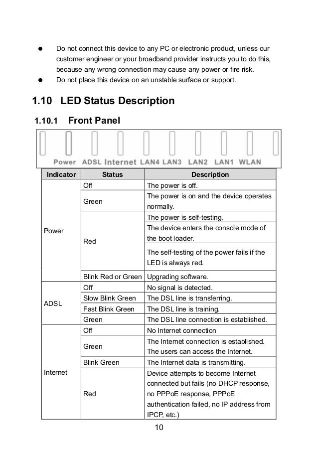 - 13. 10Do not connect this device to any PC or electronic product, unless ourcustomer engineer or your broadband provider instructs you to do this,because any wrong connection may cause any power or fire risk.Do not place this device on an unstable surface or support.1.10 LED Status Description1.10.1 Front PanelIndicator Status DescriptionOff The power is off.GreenThe power is on and the device operatesnormally.The power is self-testing.The device enters the console mode ofthe boot loader.RedThe self-testing of the power fails if theLED is always red.PowerBlink Red or Green Upgrading software.Off No signal is detected.Slow Blink Green The DSL line is transferring.Fast Blink Green The DSL line is training.ADSLGreen The DSL line connection is established.Off No Internet connectionGreenThe Internet connection is established.The users can access the Internet.Blink Green The Internet data is transmitting.InternetRedDevice attempts to become Internetconnected but fails (no DHCP response,no PPPoE response, PPPoEauthentication failed, no IP address fromIPCP, etc.)