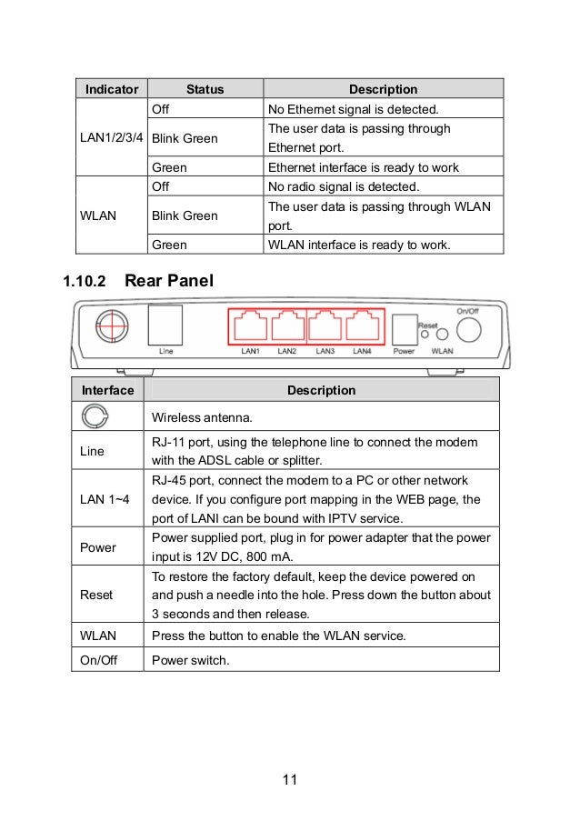 - 14. 11Indicator Status DescriptionOff No Ethernet signal is detected.Blink GreenThe user data is passing throughEthernet port.LAN1/2/3/4Green Ethernet interface is ready to workOff No radio signal is detected.Blink GreenThe user data is passing through WLANport.WLANGreen WLAN interface is ready to work.1.10.2 Rear PanelInterface DescriptionWireless antenna.LineRJ-11 port, using the telephone line to connect the modemwith the ADSL cable or splitter.LAN 1~4RJ-45 port, connect the modem to a PC or other networkdevice. If you configure port mapping in the WEB page, theport of LANI can be bound with IPTV service.PowerPower supplied port, plug in for power adapter that the powerinput is 12V DC, 800 mA.ResetTo restore the factory default, keep the device powered onand push a needle into the hole. Press down the button about3 seconds and then release.WLAN Press the button to enable the WLAN service.On/Off Power switch.