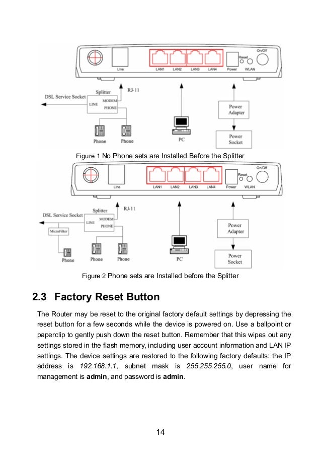 - 17. 14Figure 1 No Phone sets are Installed Before the SplitterFigure 2 Phone sets are Installed before the Splitter2.3 Factory Reset ButtonThe Router may be reset to the original factory default settings by depressing thereset button for a few seconds while the device is powered on. Use a ballpoint orpaperclip to gently push down the reset button. Remember that this wipes out anysettings stored in the flash memory, including user account information and LAN IPsettings. The device settings are restored to the following factory defaults: the IPaddress is 192.168.1.1, subnet mask is 255.255.255.0, user name formanagement is admin, and password is admin.