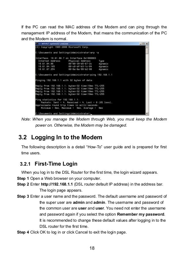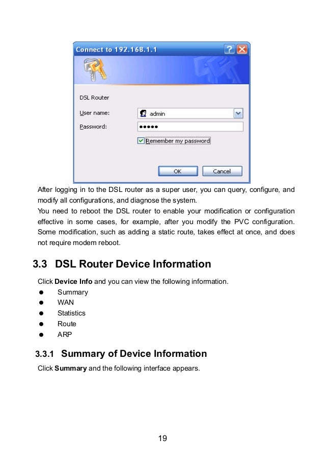 - 19. 18If the PC can read the MAC address of the Modem and can ping through themanagement IP address of the Modem, that means the communication of the PCand the Modem is normal.Note: When you manage the Modem through Web, you must keep the Modempower on. Otherwise, the Modem may be damaged.3.2 Logging In to the ModemThe following description is a detail “How-To” user guide and is prepared for firsttime users.3.2.1 First-Time LoginWhen you log in to the DSL Router for the first time, the login wizard appears.Step 1 Open a Web browser on your computer.Step 2 Enter http://192.168.1.1 (DSL router default IP address) in the address bar.The login page appears.Step 3 Enter a user name and the password. The default username and password ofthe super user are admin and admin. The username and password ofthe common user are user and user. You need not enter the usernameand password again if you select the option Remember my password.It is recommended to change these default values after logging in to theDSL router for the first time.Step 4 Click OK to log in or click Cancel to exit the login page.
