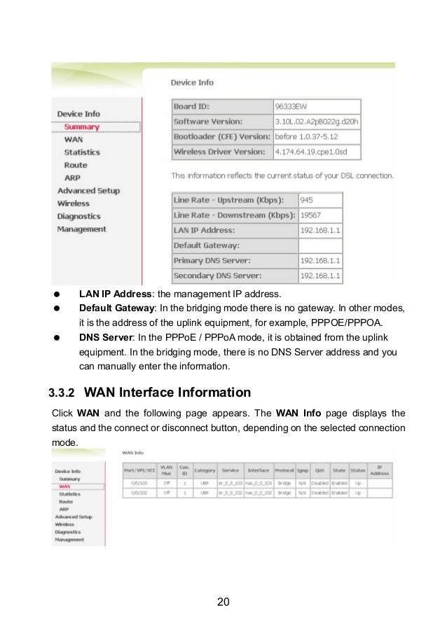 - 21. 20LAN IP Address: the management IP address.Default Gateway: In the bridging mode there is no gateway. In other modes,it is the address of the uplink equipment, for example, PPPOE/PPPOA.DNS Server: In the PPPoE / PPPoA mode, it is obtained from the uplinkequipment. In the bridging mode, there is no DNS Server address and youcan manually enter the information.3.3.2 WAN Interface InformationClick WAN and the following page appears. The WAN Info page displays thestatus and the connect or disconnect button, depending on the selected connectionmode.
