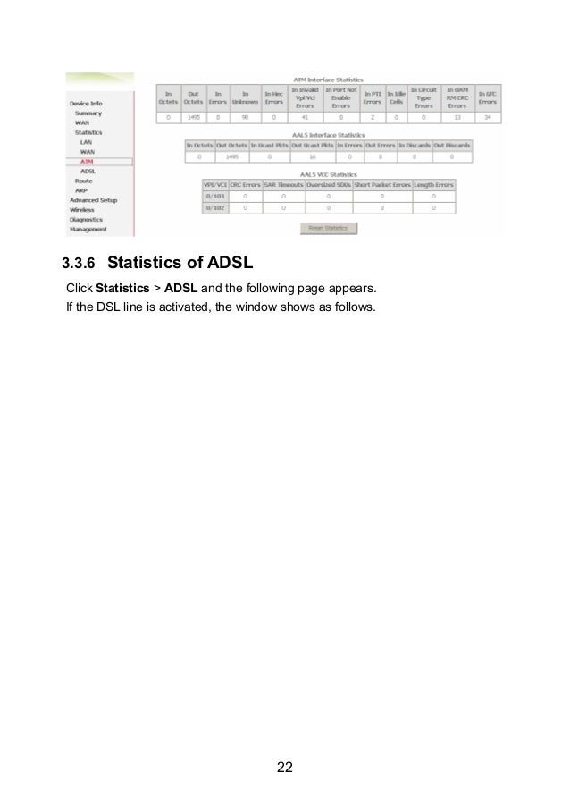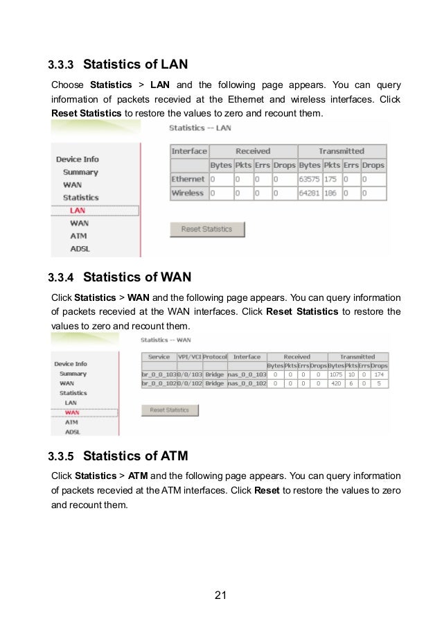 - 22. 213.3.3 Statistics of LANChoose Statistics > LAN and the following page appears. You can queryinformation of packets recevied at the Ethernet and wireless interfaces. ClickReset Statistics to restore the values to zero and recount them.3.3.4 Statistics of WANClick Statistics > WAN and the following page appears. You can query informationof packets recevied at the WAN interfaces. Click Reset Statistics to restore thevalues to zero and recount them.3.3.5 Statistics of ATMClick Statistics > ATM and the following page appears. You can query informationof packets recevied at the ATM interfaces. Click Reset to restore the values to zeroand recount them.