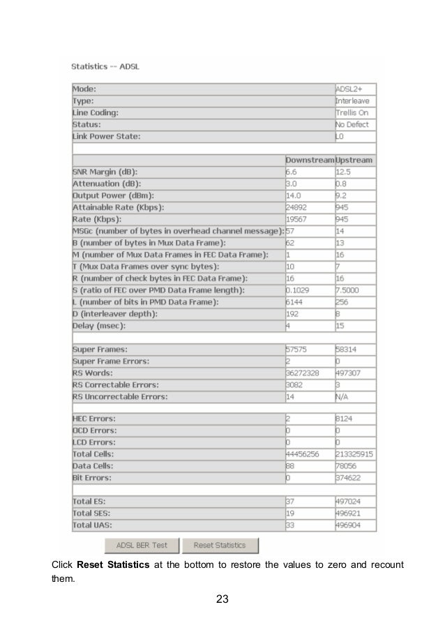- 23. 223.3.6 Statistics of ADSLClick Statistics > ADSL and the following page appears.If the DSL line is activated, the window shows as follows.