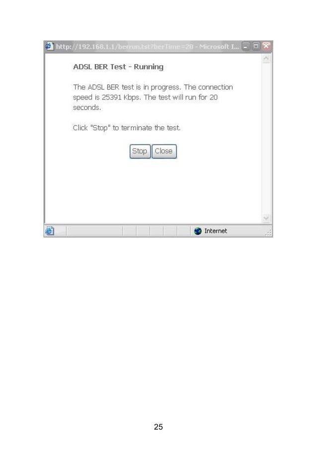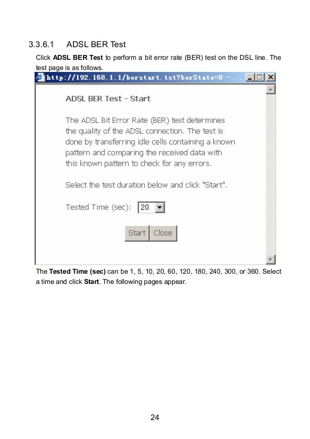 - 25. 243.3.6.1 ADSL BER TestClick ADSL BER Test to perform a bit error rate (BER) test on the DSL line. Thetest page is as follows.The Tested Time (sec) can be 1, 5, 10, 20, 60, 120, 180, 240, 300, or 360. Selecta time and click Start. The following pages appear.