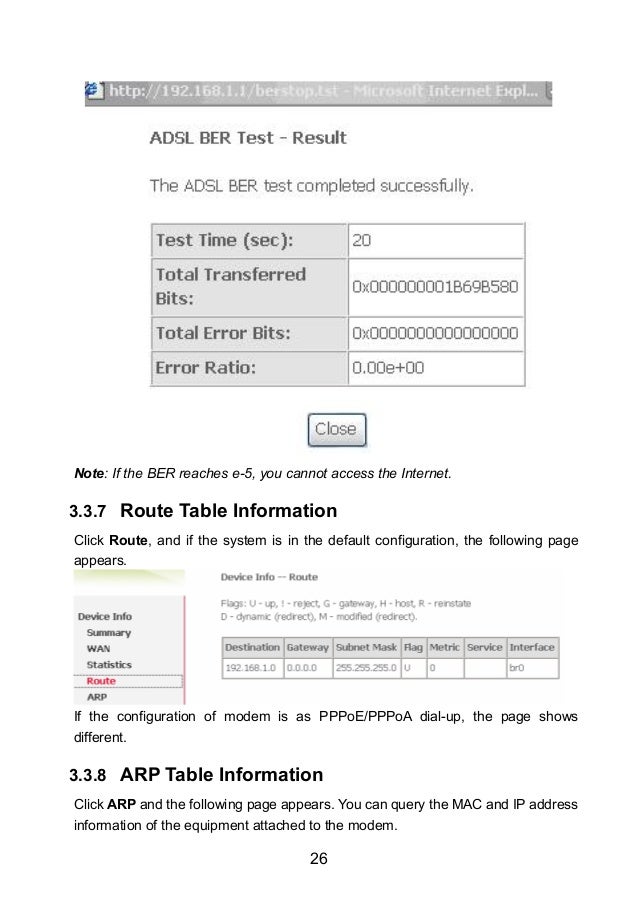 - 27. 26Note: If the BER reaches e-5, you cannot access the Internet.3.3.7 Route Table InformationClick Route, and if the system is in the default configuration, the following pageappears.If the configuration of modem is as PPPoE/PPPoA dial-up, the page showsdifferent.3.3.8 ARP Table InformationClick ARP and the following page appears. You can query the MAC and IP addressinformation of the equipment attached to the modem.