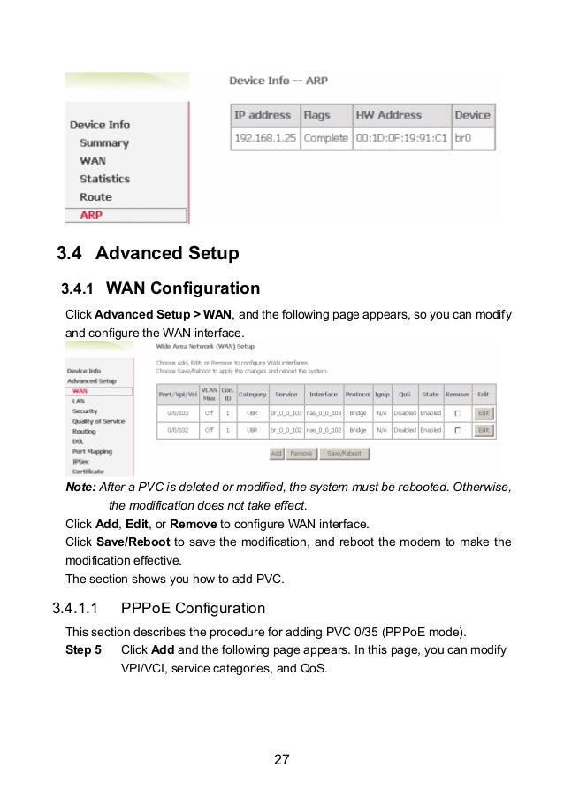 - 28. 273.4 Advanced Setup3.4.1 WAN ConfigurationClick Advanced Setup > WAN, and the following page appears, so you can modifyand configure the WAN interface.Note: After a PVC is deleted or modified, the system must be rebooted. Otherwise,the modification does not take effect.Click Add, Edit, or Remove to configure WAN interface.Click Save/Reboot to save the modification, and reboot the modem to make themodification effective.The section shows you how to add PVC.3.4.1.1 PPPoE ConfigurationThis section describes the procedure for adding PVC 0/35 (PPPoE mode).Step 5 Click Add and the following page appears. In this page, you can modifyVPI/VCI, service categories, and QoS.