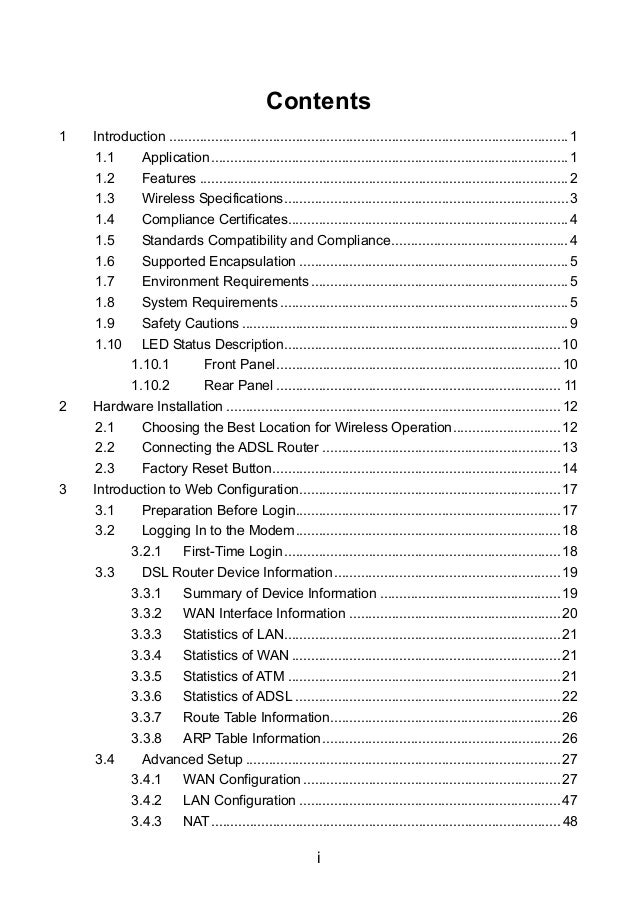 - 2. iContents1 Introduction ........................................................................................................11.1 Application.............................................................................................11.2 Features ................................................................................................21.3 Wireless Specifications..........................................................................31.4 Compliance Certificates.........................................................................41.5 Standards Compatibility and Compliance..............................................41.6 Supported Encapsulation ......................................................................51.7 Environment Requirements...................................................................51.8 System Requirements ...........................................................................51.9 Safety Cautions .....................................................................................91.10 LED Status Description........................................................................101.10.1 Front Panel..........................................................................101.10.2 Rear Panel .......................................................................... 112 Hardware Installation .......................................................................................122.1 Choosing the Best Location for Wireless Operation............................122.2 Connecting the ADSL Router ..............................................................132.3 Factory Reset Button...........................................................................143 Introduction to Web Configuration....................................................................173.1 Preparation Before Login.....................................................................173.2 Logging In to the Modem.....................................................................183.2.1 First-Time Login........................................................................183.3 DSL Router Device Information...........................................................193.3.1 Summary of Device Information ...............................................193.3.2 WAN Interface Information .......................................................203.3.3 Statistics of LAN........................................................................213.3.4 Statistics of WAN ......................................................................213.3.5 Statistics of ATM .......................................................................213.3.6 Statistics of ADSL .....................................................................223.3.7 Route Table Information............................................................263.3.8 ARP Table Information..............................................................263.4 Advanced Setup ..................................................................................273.4.1 WAN Configuration ...................................................................273.4.2 LAN Configuration ....................................................................473.4.3 NAT...........................................................................................48