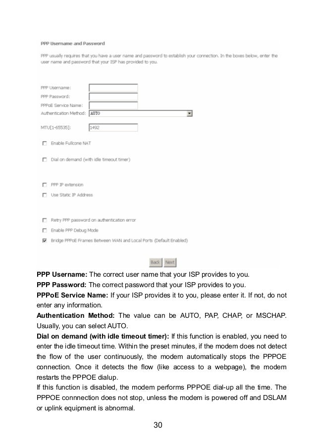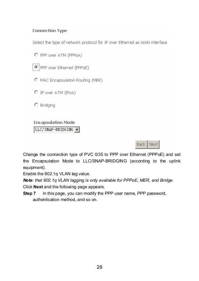 - 30. 29Change the connection type of PVC 0/35 to PPP over Ethernet (PPPoE) and setthe Encapsulation Mode to LLC/SNAP-BRIDGING (according to the uplinkequipment).Enable the 802.1q VLAN tag value.Note: that 802.1q VLAN tagging is only available for PPPoE, MER, and Bridge.Click Next and the following page appears.Step 7 In this page, you can modify the PPP user name, PPP password,authentication method, and so on.