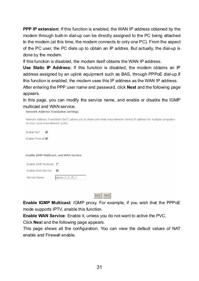 - 32. 31PPP IP extension: If this function is enabled, the WAN IP address obtained by themodem through built-in dial-up can be directly assigned to the PC being attachedto the modem (at this time, the modem connects to only one PC). From the aspectof the PC user, the PC dials up to obtain an IP addres. But actually, the dial-up isdone by the modem.If this function is disabled, the modem itself obtains the WAN IP address.Use Static IP Address: If this function is disabled, the modem obtains an IPaddress assigned by an uplink equipment such as BAS, through PPPoE dial-up.Ifthis function is enabled, the modem uses this IP address as the WAN IP address.After entering the PPP user name and password, click Next and the following pageappears.In this page, you can modify the service name, and enable or disable the IGMPmulticast and WAN service.Enable IGMP Multicast: IGMP proxy. For example, if you wish that the PPPoEmode supports IPTV, enable this function.Enable WAN Service: Enable it, unless you do not want to active the PVC.Click Next and the following page appears.This page shows all the configuration. You can view the default values of NATenable and Firewall enable.