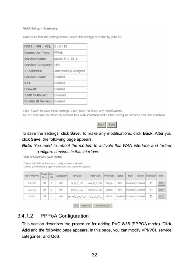 - 33. 32To save the settings, click Save. To make any modifications, click Back. After youclick Save, the following page appears.Note: You need to reboot the modem to activate this WAN interface and furtherconfigure services in this interface.3.4.1.2 PPPoA ConfigurationThis section describes the procedure for adding PVC 8/35 (PPPOA mode). ClickAdd and the following page appears. In this page, you can modify VPI/VCI, servicecategories, and QoS.