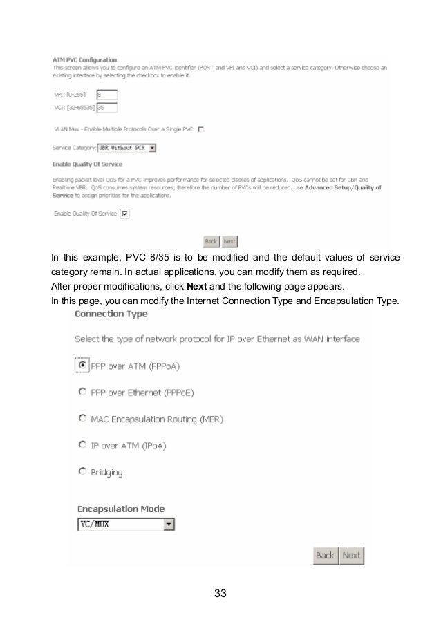 - 29. 28VPI: Virtual path between two points in an ATM network. Its valid value rangeis from 0 to 255.VCI: Virtual channel between two points in an ATM network. Its valid valuerange is from 32 to 65535 (1 to 31 are reserved for known protocols).Service Category: UBR Without PCR/UBR With PCR/CBR/Non RealtimeVBR/Realtime VBR.Enable Quality Of Service: Enable or disable QoS.In this example, PVC 0/35 is to be modified and the default values of servicecategory remain. In actual applications, you can modify them as required.After proper modifications, click Next and the following page appears.Step 6 In this page, you can modify the Internet connection type andencapsulation type.