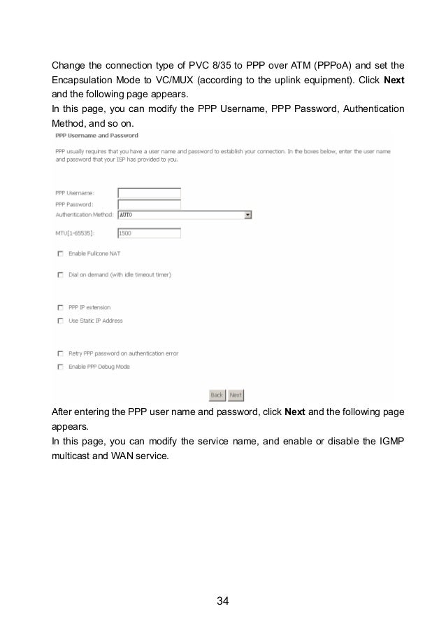 - 35. 34Change the connection type of PVC 8/35 to PPP over ATM (PPPoA) and set theEncapsulation Mode to VC/MUX (according to the uplink equipment). Click Nextand the following page appears.In this page, you can modify the PPP Username, PPP Password, AuthenticationMethod, and so on.After entering the PPP user name and password, click Next and the following pageappears.In this page, you can modify the service name, and enable or disable the IGMPmulticast and WAN service.