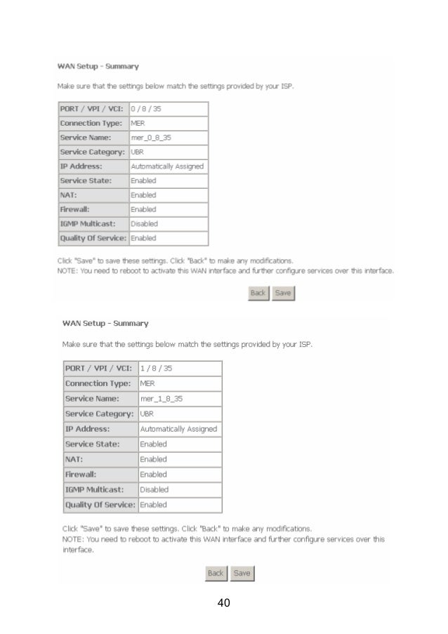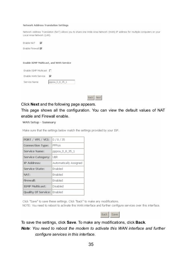 - 36. 35Click Next and the following page appears.This page shows all the configuration. You can view the default values of NATenable and Firewall enable.To save the settings, click Save. To make any modifications, click Back.Note: You need to reboot the modem to activate this WAN interface and furtherconfigure services in this interface.