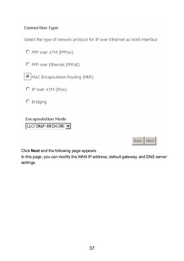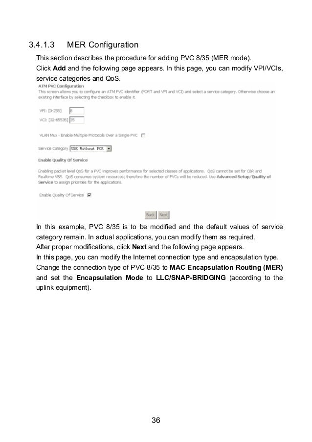 - 37. 363.4.1.3 MER ConfigurationThis section describes the procedure for adding PVC 8/35 (MER mode).Click Add and the following page appears. In this page, you can modify VPI/VCIs,service categories and QoS.In this example, PVC 8/35 is to be modified and the default values of servicecategory remain. In actual applications, you can modify them as required.After proper modifications, click Next and the following page appears.In this page, you can modify the Internet connection type and encapsulation type.Change the connection type of PVC 8/35 to MAC Encapsulation Routing (MER)and set the Encapsulation Mode to LLC/SNAP-BRIDGING (according to theuplink equipment).