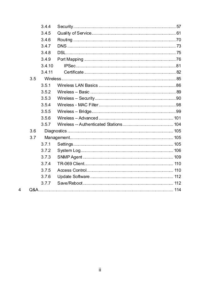 - 3. ii3.4.4 Security.....................................................................................573.4.5 Quality of Service......................................................................613.4.6 Routing .....................................................................................703.4.7 DNS ..........................................................................................733.4.8 DSL...........................................................................................753.4.9 Port Mapping ............................................................................763.4.10 IPSec...................................................................................813.4.11 Certificate ............................................................................823.5 Wireless...............................................................................................853.5.1 Wireless LAN Basics ................................................................863.5.2 Wireless – Basic .......................................................................893.5.3 Wireless – Security...................................................................903.5.4 Wireless - MAC Filter................................................................983.5.5 Wireless – Bridge......................................................................993.5.6 Wireless – Advanced ..............................................................1013.5.7 Wireless -- Authenticated Stations..........................................1043.6 Diagnostics........................................................................................1053.7 Management......................................................................................1053.7.1 Settings...................................................................................1053.7.2 System Log.............................................................................1063.7.3 SNMP Agent ...........................................................................1093.7.4 TR-069 Client.......................................................................... 1103.7.5 Access Control........................................................................ 1103.7.6 Update Software..................................................................... 1123.7.7 Save/Reboot........................................................................... 1124 Q&A................................................................................................................ 114