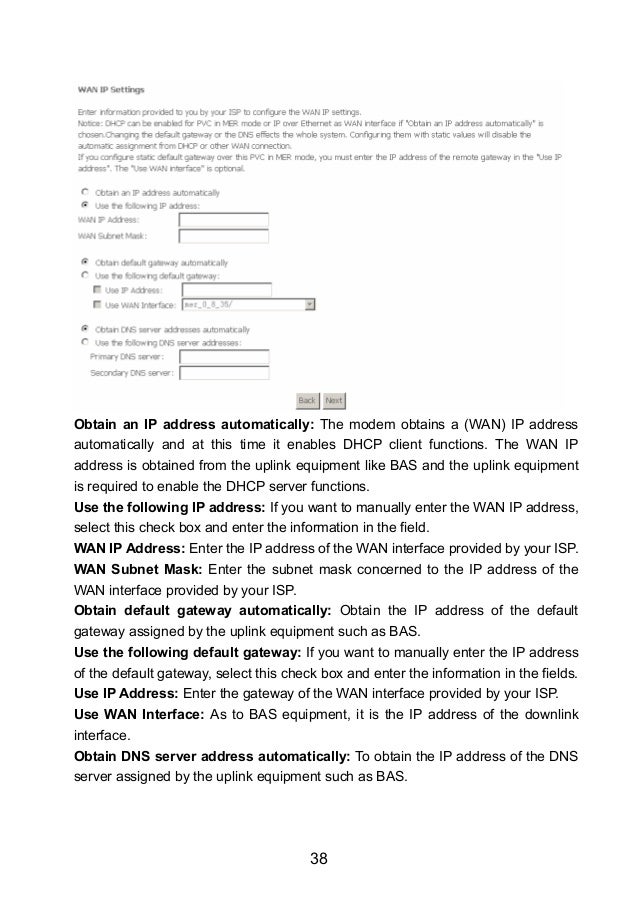 - 39. 38Obtain an IP address automatically: The modem obtains a (WAN) IP addressautomatically and at this time it enables DHCP client functions. The WAN IPaddress is obtained from the uplink equipment like BAS and the uplink equipmentis required to enable the DHCP server functions.Use the following IP address: If you want to manually enter the WAN IP address,select this check box and enter the information in the field.WAN IP Address: Enter the IP address of the WAN interface provided by your ISP.WAN Subnet Mask: Enter the subnet mask concerned to the IP address of theWAN interface provided by your ISP.Obtain default gateway automatically: Obtain the IP address of the defaultgateway assigned by the uplink equipment such as BAS.Use the following default gateway: If you want to manually enter the IP addressof the default gateway, select this check box and enter the information in the fields.Use IP Address: Enter the gateway of the WAN interface provided by your ISP.Use WAN Interface: As to BAS equipment, it is the IP address of the downlinkinterface.Obtain DNS server address automatically: To obtain the IP address of the DNSserver assigned by the uplink equipment such as BAS.