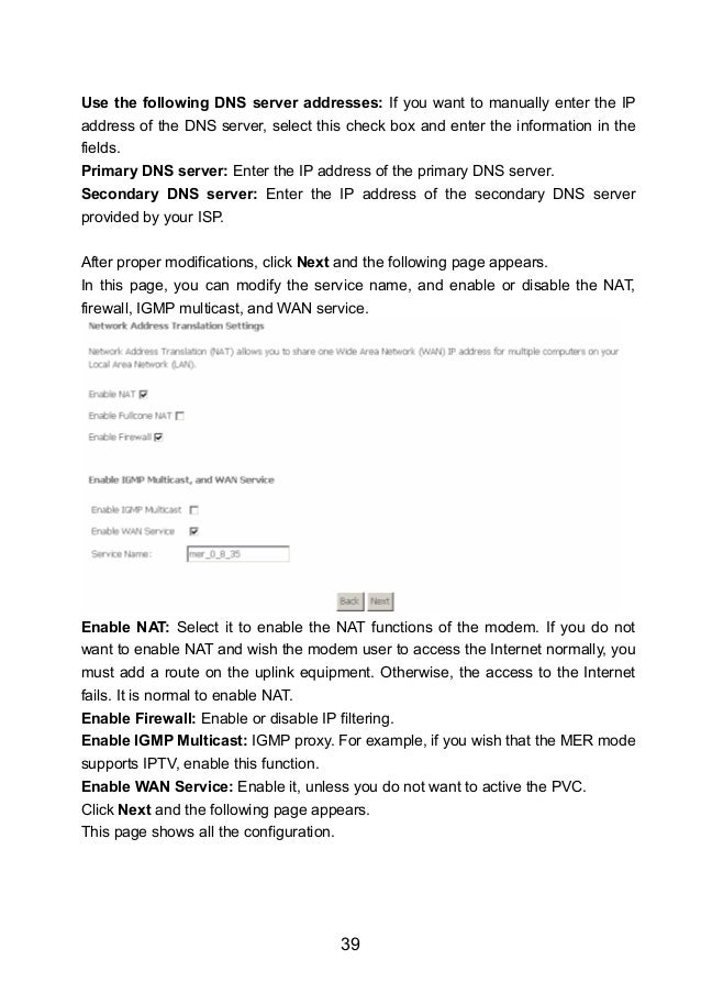 - 40. 39Use the following DNS server addresses: If you want to manually enter the IPaddress of the DNS server, select this check box and enter the information in thefields.Primary DNS server: Enter the IP address of the primary DNS server.Secondary DNS server: Enter the IP address of the secondary DNS serverprovided by your ISP.After proper modifications, click Next and the following page appears.In this page, you can modify the service name, and enable or disable the NAT,firewall, IGMP multicast, and WAN service.Enable NAT: Select it to enable the NAT functions of the modem. If you do notwant to enable NAT and wish the modem user to access the Internet normally, youmust add a route on the uplink equipment. Otherwise, the access to the Internetfails. It is normal to enable NAT.Enable Firewall: Enable or disable IP filtering.Enable IGMP Multicast: IGMP proxy. For example, if you wish that the MER modesupports IPTV, enable this function.Enable WAN Service: Enable it, unless you do not want to active the PVC.Click Next and the following page appears.This page shows all the configuration.