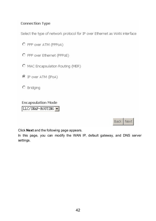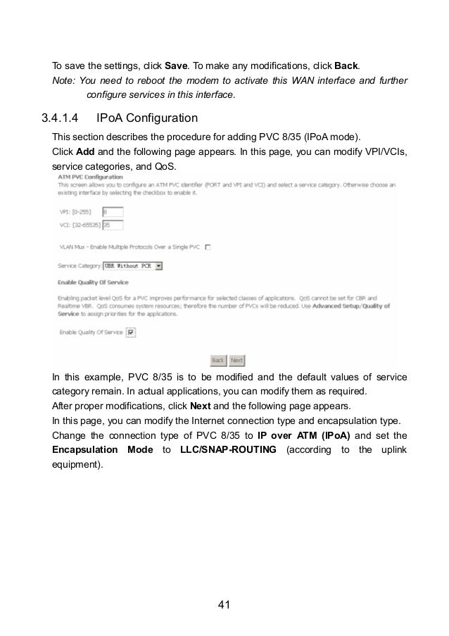 - 42. 41To save the settings, click Save. To make any modifications, click Back.Note: You need to reboot the modem to activate this WAN interface and furtherconfigure services in this interface.3.4.1.4 IPoA ConfigurationThis section describes the procedure for adding PVC 8/35 (IPoA mode).Click Add and the following page appears. In this page, you can modify VPI/VCIs,service categories, and QoS.In this example, PVC 8/35 is to be modified and the default values of servicecategory remain. In actual applications, you can modify them as required.After proper modifications, click Next and the following page appears.In this page, you can modify the Internet connection type and encapsulation type.Change the connection type of PVC 8/35 to IP over ATM (IPoA) and set theEncapsulation Mode to LLC/SNAP-ROUTING (according to the uplinkequipment).