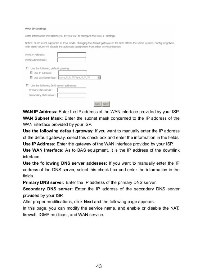 - 44. 43WAN IP Address: Enter the IP address of the WAN interface provided by your ISP.WAN Subnet Mask: Enter the subnet mask concerned to the IP address of theWAN interface provided by your ISP.Use the following default gateway: If you want to manually enter the IP addressof the default gateway, select this check box and enter the information in the fields.Use IP Address: Enter the gateway of the WAN interface provided by your ISP.Use WAN Interface: As to BAS equipment, it is the IP address of the downlinkinterface.Use the following DNS server addesses: If you want to manually enter the IPaddress of the DNS server, select this check box and enter the information in thefields.Primary DNS server: Enter the IP address of the primary DNS server.Secondary DNS server: Enter the IP address of the secondary DNS serverprovided by your ISP.After proper modifications, click Next and the following page appears.In this page, you can modify the service name, and enable or disable the NAT,firewall, IGMP multicast, and WAN service.