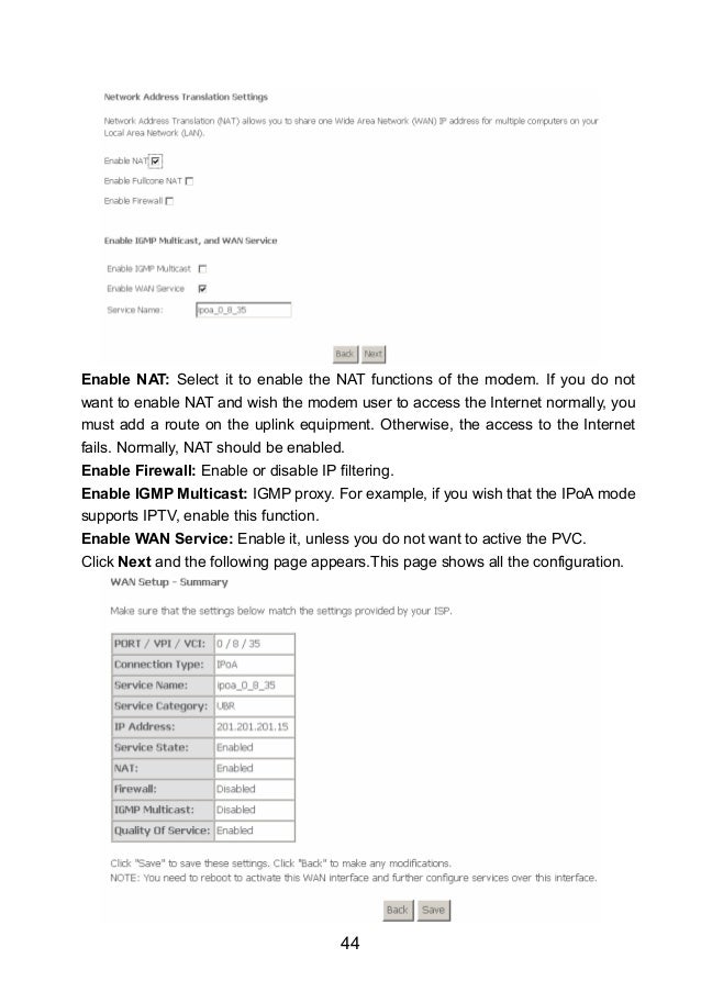- 45. 44Enable NAT: Select it to enable the NAT functions of the modem. If you do notwant to enable NAT and wish the modem user to access the Internet normally, youmust add a route on the uplink equipment. Otherwise, the access to the Internetfails. Normally, NAT should be enabled.Enable Firewall: Enable or disable IP filtering.Enable IGMP Multicast: IGMP proxy. For example, if you wish that the IPoA modesupports IPTV, enable this function.Enable WAN Service: Enable it, unless you do not want to active the PVC.Click Next and the following page appears.This page shows all the configuration.