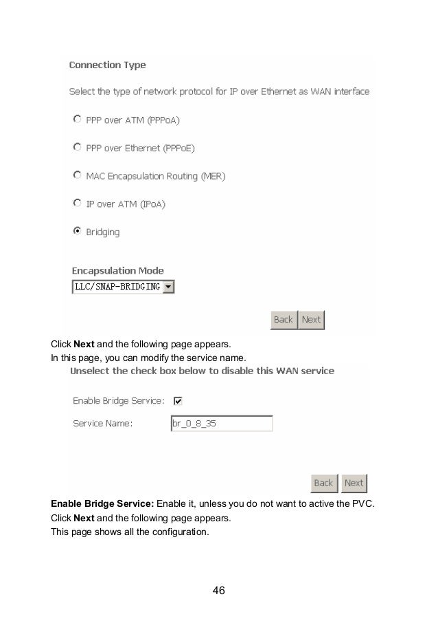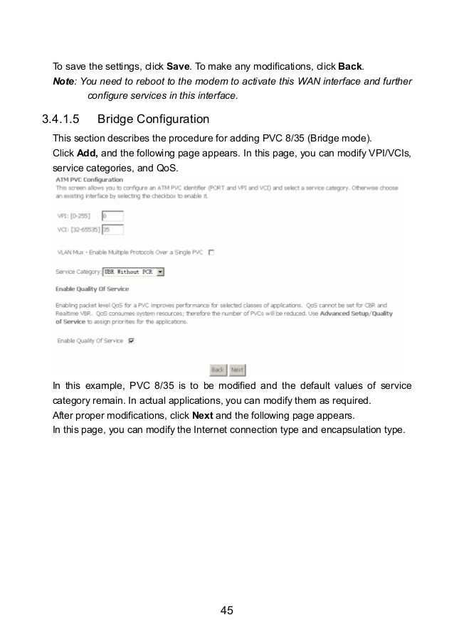 - 46. 45To save the settings, click Save. To make any modifications, click Back.Note: You need to reboot to the modem to activate this WAN interface and furtherconfigure services in this interface.3.4.1.5 Bridge ConfigurationThis section describes the procedure for adding PVC 8/35 (Bridge mode).Click Add, and the following page appears. In this page, you can modify VPI/VCIs,service categories, and QoS.In this example, PVC 8/35 is to be modified and the default values of servicecategory remain. In actual applications, you can modify them as required.After proper modifications, click Next and the following page appears.In this page, you can modify the Internet connection type and encapsulation type.