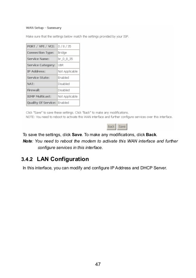 - 48. 47To save the settings, click Save. To make any modifications, click Back.Note: You need to reboot the modem to activate this WAN interface and furtherconfigure services in this interface.3.4.2 LAN ConfigurationIn this interface, you can modify and configure IP Address and DHCP Server.