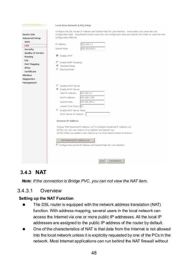 - 49. 483.4.3 NATNote: If the connection is Bridge PVC, you can not view the NAT item.3.4.3.1 OverviewSetting up the NAT FunctionThe DSL router is equipped with the network address translation (NAT)function. With address mapping, several users in the local network canaccess the Internet via one or more public IP addresses. All the local IPaddresses are assigned to the public IP address of the router by default.One of the characteristics of NAT is that data from the Internet is not allowedinto the local network unless it is explicitly requested by one of the PCs in thenetwork. Most Internet applications can run behind the NAT firewall without