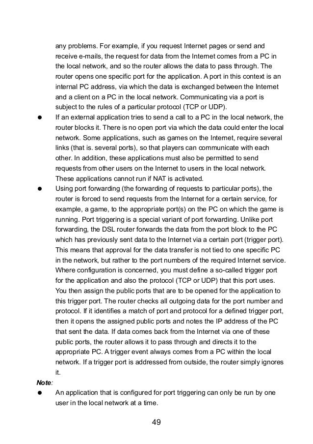 - 50. 49any problems. For example, if you request Internet pages or send andreceive e-mails, the request for data from the Internet comes from a PC inthe local network, and so the router allows the data to pass through. Therouter opens one specific port for the application. A port in this context is aninternal PC address, via which the data is exchanged between the Internetand a client on a PC in the local network. Communicating via a port issubject to the rules of a particular protocol (TCP or UDP).If an external application tries to send a call to a PC in the local network, therouter blocks it. There is no open port via which the data could enter the localnetwork. Some applications, such as games on the Internet, require severallinks (that is. several ports), so that players can communicate with eachother. In addition, these applications must also be permitted to sendrequests from other users on the Internet to users in the local network.These applications cannot run if NAT is activated.Using port forwarding (the forwarding of requests to particular ports), therouter is forced to send requests from the Internet for a certain service, forexample, a game, to the appropriate port(s) on the PC on which the game isrunning. Port triggering is a special variant of port forwarding. Unlike portforwarding, the DSL router forwards the data from the port block to the PCwhich has previously sent data to the Internet via a certain port (trigger port).This means that approval for the data transfer is not tied to one specific PCin the network, but rather to the port numbers of the required Internet service.Where configuration is concerned, you must define a so-called trigger portfor the application and also the protocol (TCP or UDP) that this port uses.You then assign the public ports that are to be opened for the application tothis trigger port. The router checks all outgoing data for the port number andprotocol. If it identifies a match of port and protocol for a defined trigger port,then it opens the assigned public ports and notes the IP address of the PCthat sent the data. If data comes back from the Internet via one of thesepublic ports, the router allows it to pass through and directs it to theappropriate PC. A trigger event always comes from a PC within the localnetwork. If a trigger port is addressed from outside, the router simply ignoresit.Note:An application that is configured for port triggering can only be run by oneuser in the local network at a time.