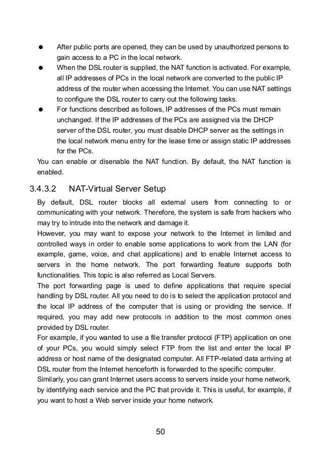 - 51. 50After public ports are opened, they can be used by unauthorized persons togain access to a PC in the local network.When the DSL router is supplied, the NAT function is activated. For example,all IP addresses of PCs in the local network are converted to the public IPaddress of the router when accessing the Internet. You can use NAT settingsto configure the DSL router to carry out the following tasks.For functions described as follows, IP addresses of the PCs must remainunchanged. If the IP addresses of the PCs are assigned via the DHCPserver of the DSL router, you must disable DHCP server as the settings inthe local network menu entry for the lease time or assign static IP addressesfor the PCs.You can enable or disenable the NAT function. By default, the NAT function isenabled.3.4.3.2 NAT-Virtual Server SetupBy default, DSL router blocks all external users from connecting to orcommunicating with your network. Therefore, the system is safe from hackers whomay try to intrude into the network and damage it.However, you may want to expose your network to the Internet in limited andcontrolled ways in order to enable some applications to work from the LAN (forexample, game, voice, and chat applications) and to enable Internet access toservers in the home network. The port forwarding feature supports bothfunctionalities. This topic is also referred as Local Servers.The port forwarding page is used to define applications that require specialhandling by DSL router. All you need to do is to select the application protocol andthe local IP address of the computer that is using or providing the service. Ifrequired, you may add new protocols in addition to the most common onesprovided by DSL router.For example, if you wanted to use a file transfer protocol (FTP) application on oneof your PCs, you would simply select FTP from the list and enter the local IPaddress or host name of the designated computer. All FTP-related data arriving atDSL router from the Internet henceforth is forwarded to the specific computer.Similarly, you can grant Internet users access to servers inside your home network,by identifying each service and the PC that provide it. This is useful, for example, ifyou want to host a Web server inside your home network.