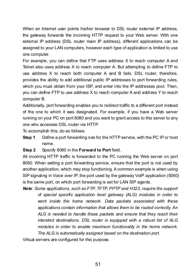 - 52. 51When an Internet user points his/her browser to DSL router external IP address,the gateway forwards the incoming HTTP request to your Web server. With oneexternal IP address (DSL router main IP address), different applications can beassigned to your LAN computers, however each type of application is limited to useone computer.For example, you can define that FTP uses address X to reach computer A andTelnet also uses address X to reach computer A. But attempting to define FTP touse address X to reach both computer A and B fails. DSL router, therefore,provides the ability to add additional public IP addresses to port forwarding rules,which you must obtain from your ISP, and enter into the IP addresses pool. Then,you can define FTP to use address X to reach computer A and address Y to reachcomputer B.Additionally, port forwarding enables you to redirect traffic to a different port insteadof the one to which it was designated. For example, if you have a Web serverrunning on your PC on port 8080 and you want to grant access to this server to anyone who accesses DSL router via HTTP.To accomplish this, do as follows:Step 1 Define a port forwarding rule for the HTTP service, with the PC IP or hostname.Step 2 Specify 8080 in the Forward to Port field.All incoming HTTP traffic is forwarded to the PC running the Web server on port8080. When setting a port forwarding service, ensure that the port is not used byanother application, which may stop functioning. A common example is when usingSIP signaling in Voice over IP, the port used by the gateway VoIP application (5060)is the same port, on which port forwarding is set for LAN SIP agents.Note: Some applications, such as FTP, TFTP, PPTP and H323, require the supportof special specific application level gateway (ALG) modules in order towork inside the home network. Data packets associated with theseapplications contain information that allows them to be routed correctly. AnALG is needed to handle these packets and ensure that they reach theirintended destinations. DSL router is equipped with a robust list of ALGmodules in order to enable maximum functionality in the home network.The ALG is automatically assigned based on the destination port.Virtual servers are configured for this purpose.