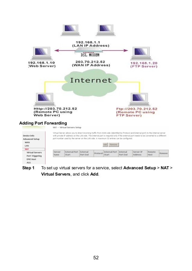 - 53. 52Adding Port ForwardingStep 1 To set up virtual servers for a service, select Advanced Setup > NAT >Virtual Servers, and click Add.