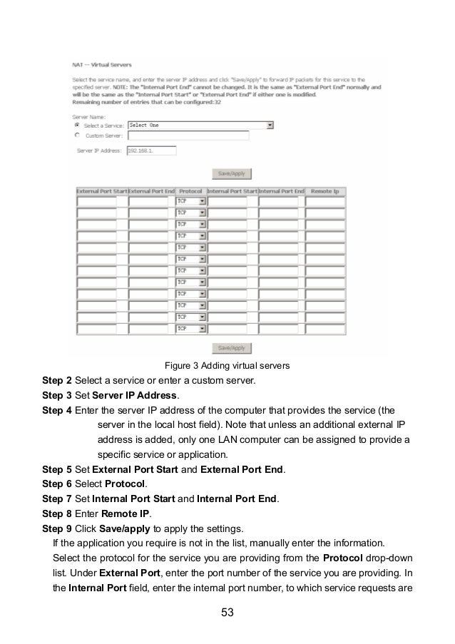 - 54. 53Figure 3 Adding virtual serversStep 2 Select a service or enter a custom server.Step 3 Set Server IP Address.Step 4 Enter the server IP address of the computer that provides the service (theserver in the local host field). Note that unless an additional external IPaddress is added, only one LAN computer can be assigned to provide aspecific service or application.Step 5 Set External Port Start and External Port End.Step 6 Select Protocol.Step 7 Set Internal Port Start and Internal Port End.Step 8 Enter Remote IP.Step 9 Click Save/apply to apply the settings.If the application you require is not in the list, manually enter the information.Select the protocol for the service you are providing from the Protocol drop-downlist. Under External Port, enter the port number of the service you are providing. Inthe Internal Port field, enter the internal port number, to which service requests are