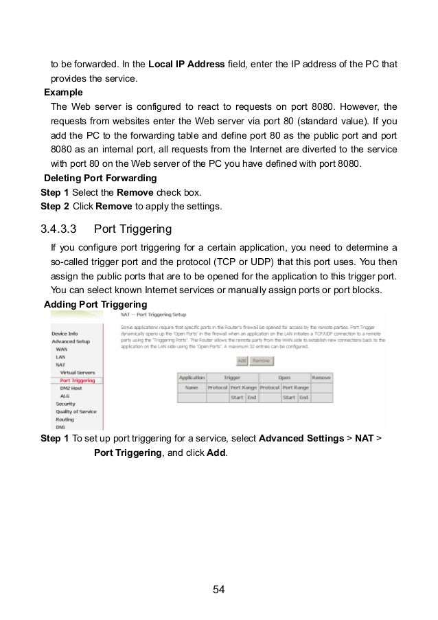 - 55. 54to be forwarded. In the Local IP Address field, enter the IP address of the PC thatprovides the service.ExampleThe Web server is configured to react to requests on port 8080. However, therequests from websites enter the Web server via port 80 (standard value). If youadd the PC to the forwarding table and define port 80 as the public port and port8080 as an internal port, all requests from the Internet are diverted to the servicewith port 80 on the Web server of the PC you have defined with port 8080.Deleting Port ForwardingStep 1 Select the Remove check box.Step 2 Click Remove to apply the settings.3.4.3.3 Port TriggeringIf you configure port triggering for a certain application, you need to determine aso-called trigger port and the protocol (TCP or UDP) that this port uses. You thenassign the public ports that are to be opened for the application to this trigger port.You can select known Internet services or manually assign ports or port blocks.Adding Port TriggeringStep 1 To set up port triggering for a service, select Advanced Settings > NAT >Port Triggering, and click Add.