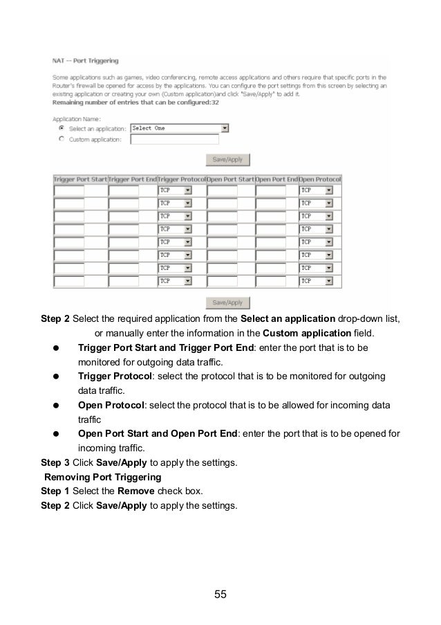 - 56. 55Step 2 Select the required application from the Select an application drop-down list,or manually enter the information in the Custom application field.Trigger Port Start and Trigger Port End: enter the port that is to bemonitored for outgoing data traffic.Trigger Protocol: select the protocol that is to be monitored for outgoingdata traffic.Open Protocol: select the protocol that is to be allowed for incoming datatrafficOpen Port Start and Open Port End: enter the port that is to be opened forincoming traffic.Step 3 Click Save/Apply to apply the settings.Removing Port TriggeringStep 1 Select the Remove check box.Step 2 Click Save/Apply to apply the settings.