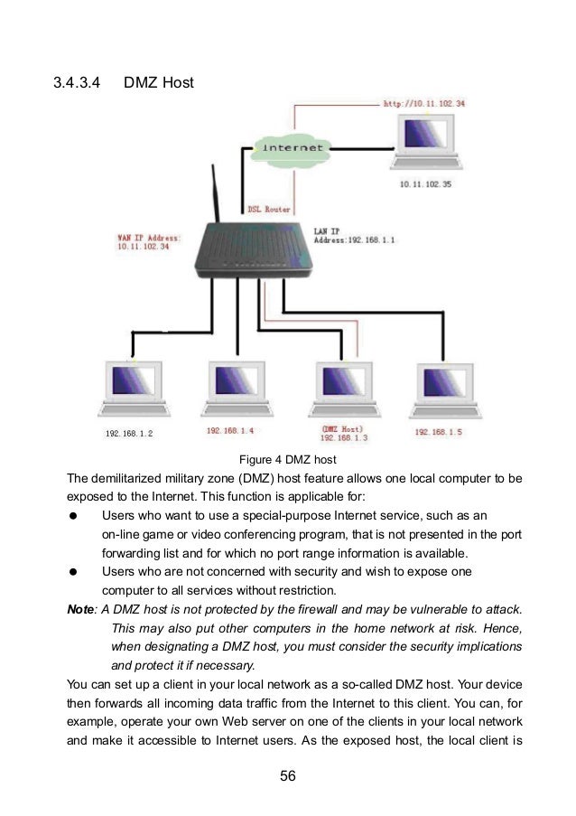 - 57. 563.4.3.4 DMZ HostFigure 4 DMZ hostThe demilitarized military zone (DMZ) host feature allows one local computer to beexposed to the Internet. This function is applicable for:Users who want to use a special-purpose Internet service, such as anon-line game or video conferencing program, that is not presented in the portforwarding list and for which no port range information is available.Users who are not concerned with security and wish to expose onecomputer to all services without restriction.Note: A DMZ host is not protected by the firewall and may be vulnerable to attack.This may also put other computers in the home network at risk. Hence,when designating a DMZ host, you must consider the security implicationsand protect it if necessary.You can set up a client in your local network as a so-called DMZ host. Your devicethen forwards all incoming data traffic from the Internet to this client. You can, forexample, operate your own Web server on one of the clients in your local networkand make it accessible to Internet users. As the exposed host, the local client is