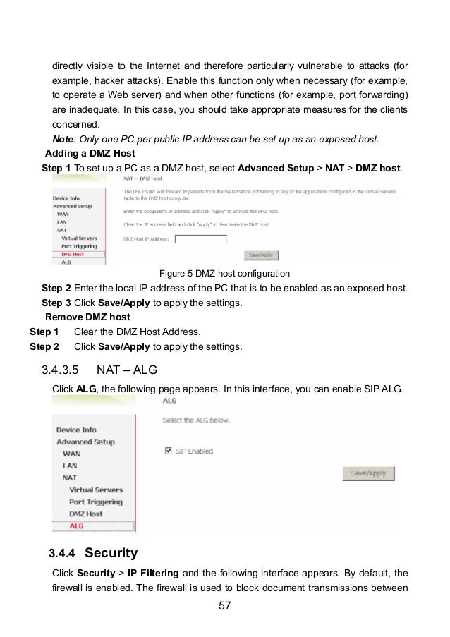 - 58. 57directly visible to the Internet and therefore particularly vulnerable to attacks (forexample, hacker attacks). Enable this function only when necessary (for example,to operate a Web server) and when other functions (for example, port forwarding)are inadequate. In this case, you should take appropriate measures for the clientsconcerned.Note: Only one PC per public IP address can be set up as an exposed host.Adding a DMZ HostStep 1 To set up a PC as a DMZ host, select Advanced Setup > NAT > DMZ host.Figure 5 DMZ host configurationStep 2 Enter the local IP address of the PC that is to be enabled as an exposed host.Step 3 Click Save/Apply to apply the settings.Remove DMZ hostStep 1 Clear the DMZ Host Address.Step 2 Click Save/Apply to apply the settings.3.4.3.5 NAT – ALGClick ALG, the following page appears. In this interface, you can enable SIP ALG.3.4.4 SecurityClick Security > IP Filtering and the following interface appears. By default, thefirewall is enabled. The firewall is used to block document transmissions between