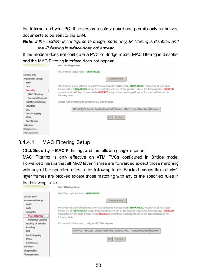 - 59. 58the Internet and your PC. It serves as a safety guard and permits only authorizeddocuments to be sent to the LAN.Note: If the modem is configured to bridge mode only, IP filtering is disabled andthe IP filtering interface does not appear.If the modem does not configure a PVC of Bridge mode, MAC filtering is disabledand the MAC Filtering interface does not appear.3.4.4.1 MAC Filtering SetupClick Security > MAC Filtering, and the following page apperas.MAC Filtering is only effective on ATM PVCs configured in Bridge mode.Forwarded means that all MAC layer frames are forwarded except those matchingwith any of the specified rules in the following table. Blocked means that all MAClayer frames are blocked except those matching with any of the specified rules inthe following table.
