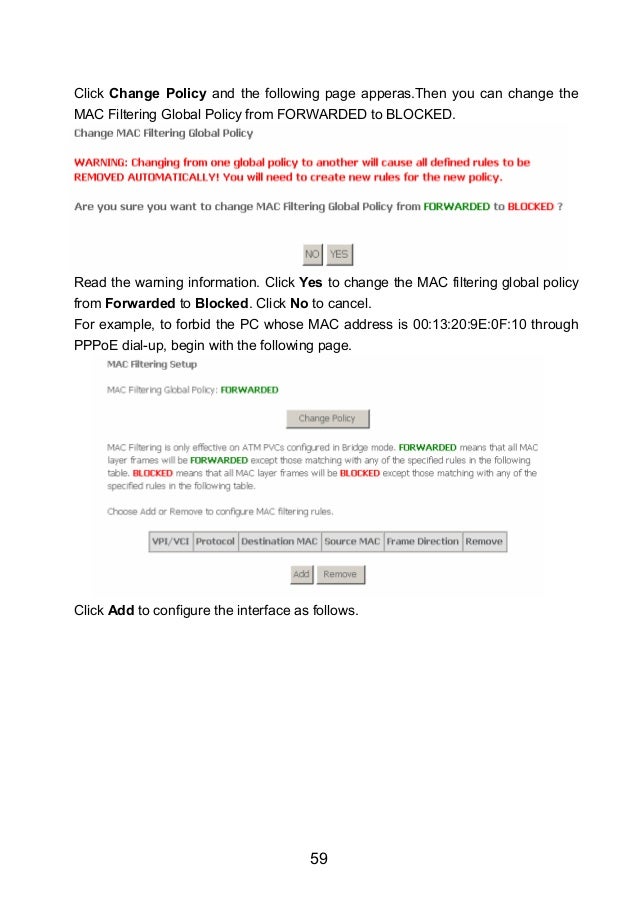 - 60. 59Click Change Policy and the following page apperas.Then you can change theMAC Filtering Global Policy from FORWARDED to BLOCKED.Read the warning information. Click Yes to change the MAC filtering global policyfrom Forwarded to Blocked. Click No to cancel.For example, to forbid the PC whose MAC address is 00:13:20:9E:0F:10 throughPPPoE dial-up, begin with the following page.Click Add to configure the interface as follows.