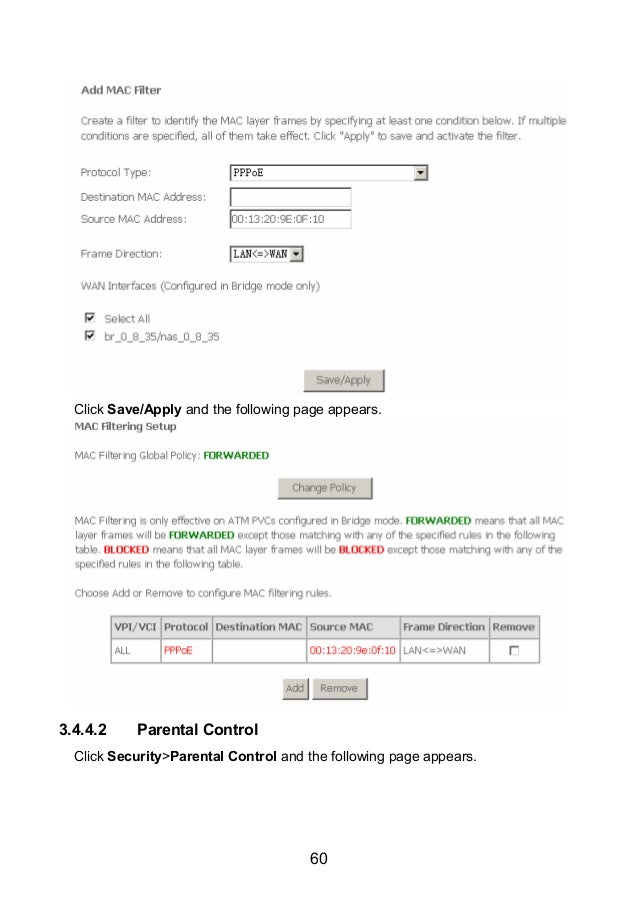 - 61. 60Click Save/Apply and the following page appears.3.4.4.2 Parental ControlClick Security>Parental Control and the following page appears.