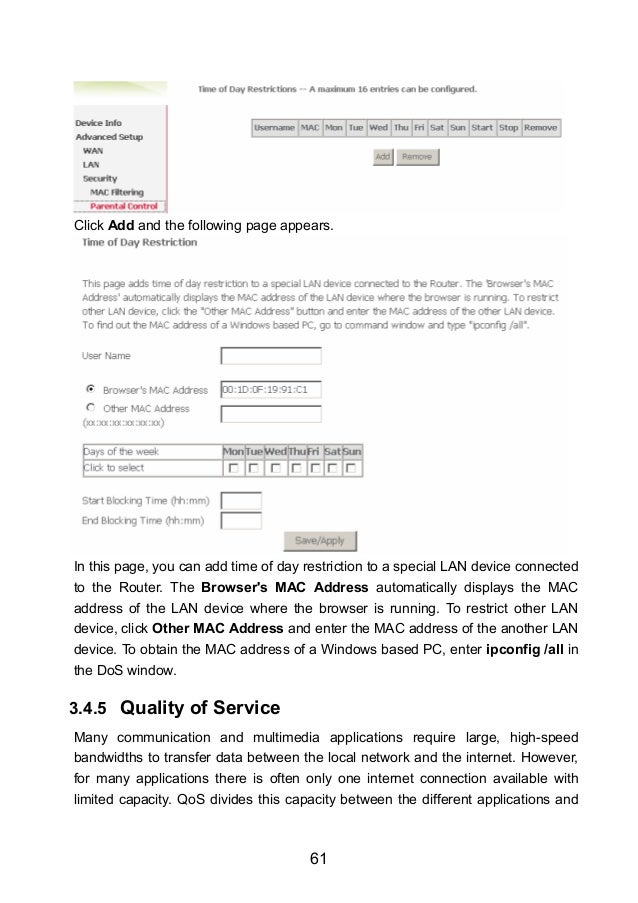 - 62. 61Click Add and the following page appears.In this page, you can add time of day restriction to a special LAN device connectedto the Router. The Browsers MAC Address automatically displays the MACaddress of the LAN device where the browser is running. To restrict other LANdevice, click Other MAC Address and enter the MAC address of the another LANdevice. To obtain the MAC address of a Windows based PC, enter ipconfig /all inthe DoS window.3.4.5 Quality of ServiceMany communication and multimedia applications require large, high-speedbandwidths to transfer data between the local network and the internet. However,for many applications there is often only one internet connection available withlimited capacity. QoS divides this capacity between the different applications and