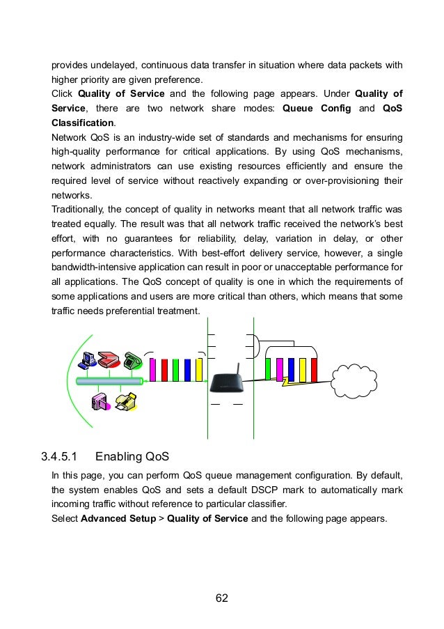- 63. 62provides undelayed, continuous data transfer in situation where data packets withhigher priority are given preference.Click Quality of Service and the following page appears. Under Quality ofService, there are two network share modes: Queue Config and QoSClassification.Network QoS is an industry-wide set of standards and mechanisms for ensuringhigh-quality performance for critical applications. By using QoS mechanisms,network administrators can use existing resources efficiently and ensure therequired level of service without reactively expanding or over-provisioning theirnetworks.Traditionally, the concept of quality in networks meant that all network traffic wastreated equally. The result was that all network traffic received the network’s besteffort, with no guarantees for reliability, delay, variation in delay, or otherperformance characteristics. With best-effort delivery service, however, a singlebandwidth-intensive application can result in poor or unacceptable performance forall applications. The QoS concept of quality is one in which the requirements ofsome applications and users are more critical than others, which means that sometraffic needs preferential treatment.3.4.5.1 Enabling QoSIn this page, you can perform QoS queue management configuration. By default,the system enables QoS and sets a default DSCP mark to automatically markincoming traffic without reference to particular classifier.Select Advanced Setup > Quality of Service and the following page appears.
