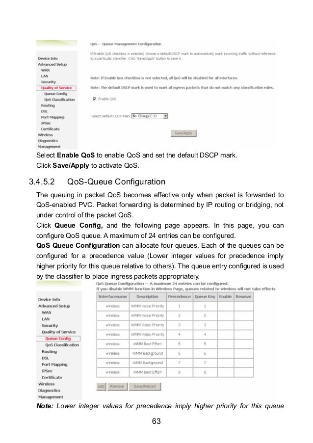 - 64. 63Select Enable QoS to enable QoS and set the default DSCP mark.Click Save/Apply to activate QoS.3.4.5.2 QoS-Queue ConfigurationThe queuing in packet QoS becomes effective only when packet is forwarded toQoS-enabled PVC. Packet forwarding is determined by IP routing or bridging, notunder control of the packet QoS.Click Queue Config, and the following page appears. In this page, you canconfigure QoS queue. A maximum of 24 entries can be configured.QoS Queue Configuration can allocate four queues. Each of the queues can beconfigured for a precedence value (Lower integer values for precedence implyhigher priority for this queue relative to others). The queue entry configured is usedby the classifier to place ingress packets appropriately.Note: Lower integer values for precedence imply higher priority for this queue