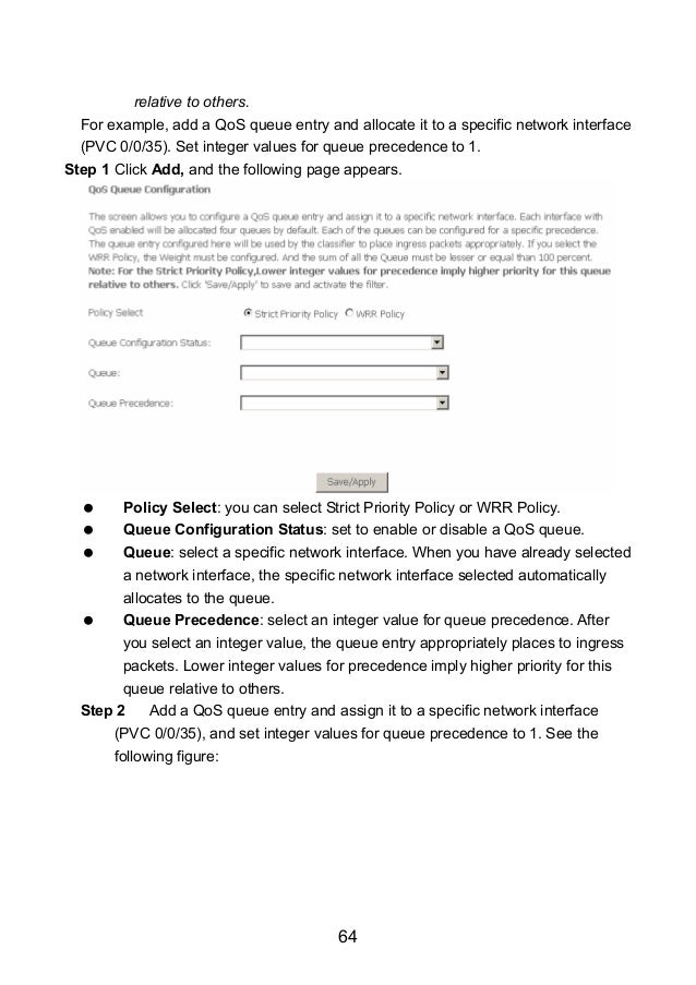 - 65. 64relative to others.For example, add a QoS queue entry and allocate it to a specific network interface(PVC 0/0/35). Set integer values for queue precedence to 1.Step 1 Click Add, and the following page appears.Policy Select: you can select Strict Priority Policy or WRR Policy.Queue Configuration Status: set to enable or disable a QoS queue.Queue: select a specific network interface. When you have already selecteda network interface, the specific network interface selected automaticallyallocates to the queue.Queue Precedence: select an integer value for queue precedence. Afteryou select an integer value, the queue entry appropriately places to ingresspackets. Lower integer values for precedence imply higher priority for thisqueue relative to others.Step 2 Add a QoS queue entry and assign it to a specific network interface(PVC 0/0/35), and set integer values for queue precedence to 1. See thefollowing figure: