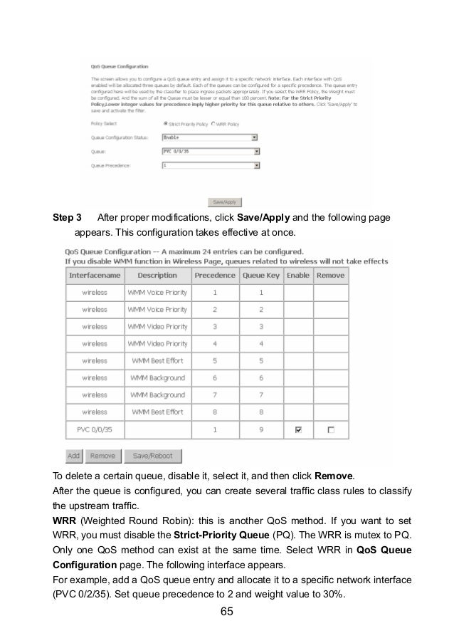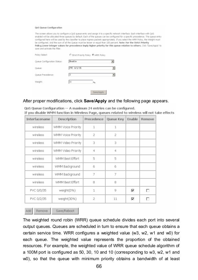 - 66. 65Step 3 After proper modifications, click Save/Apply and the following pageappears. This configuration takes effective at once.To delete a certain queue, disable it, select it, and then click Remove.After the queue is configured, you can create several traffic class rules to classifythe upstream traffic.WRR (Weighted Round Robin): this is another QoS method. If you want to setWRR, you must disable the Strict-Priority Queue (PQ). The WRR is mutex to PQ.Only one QoS method can exist at the same time. Select WRR in QoS QueueConfiguration page. The following interface appears.For example, add a QoS queue entry and allocate it to a specific network interface(PVC 0/2/35). Set queue precedence to 2 and weight value to 30%.